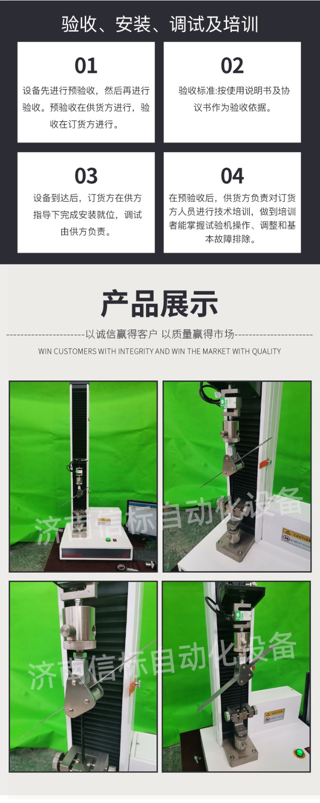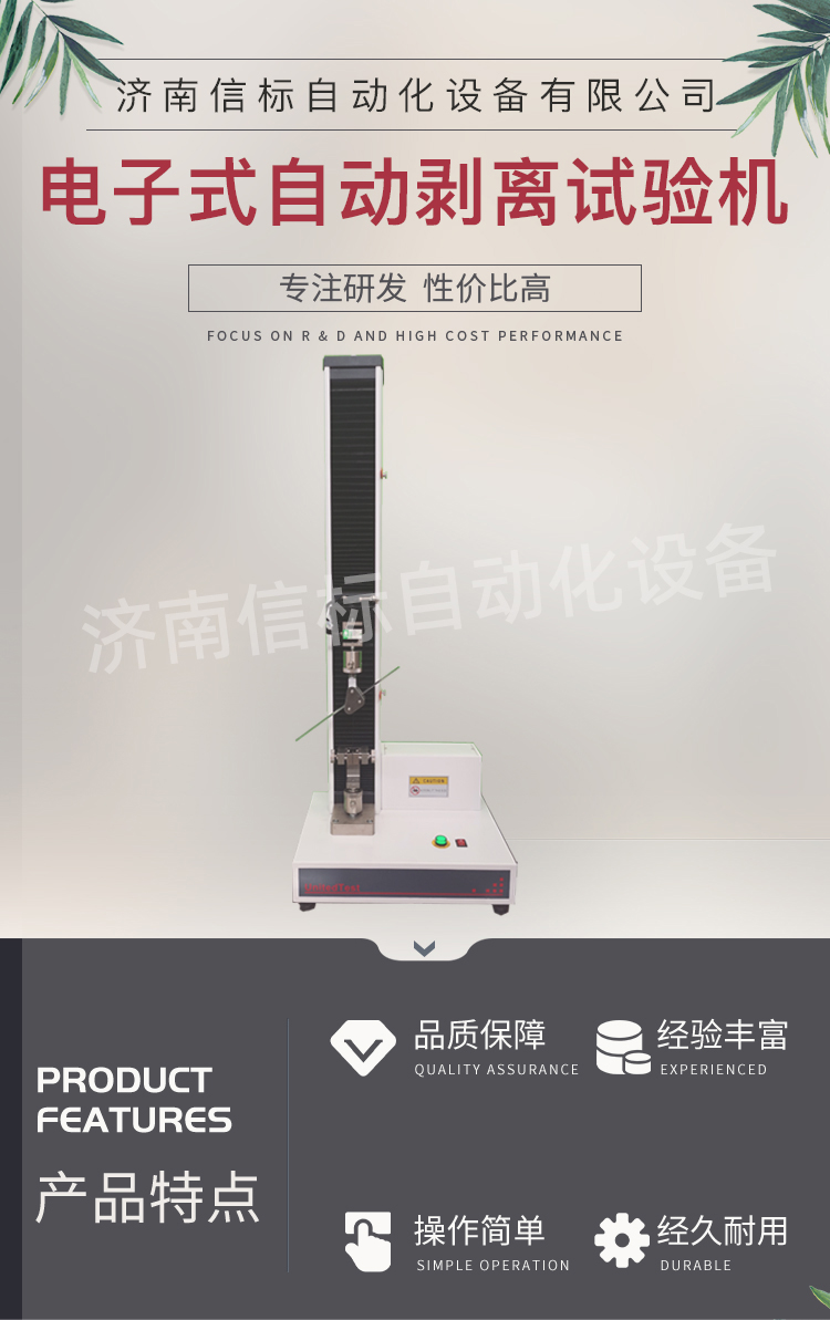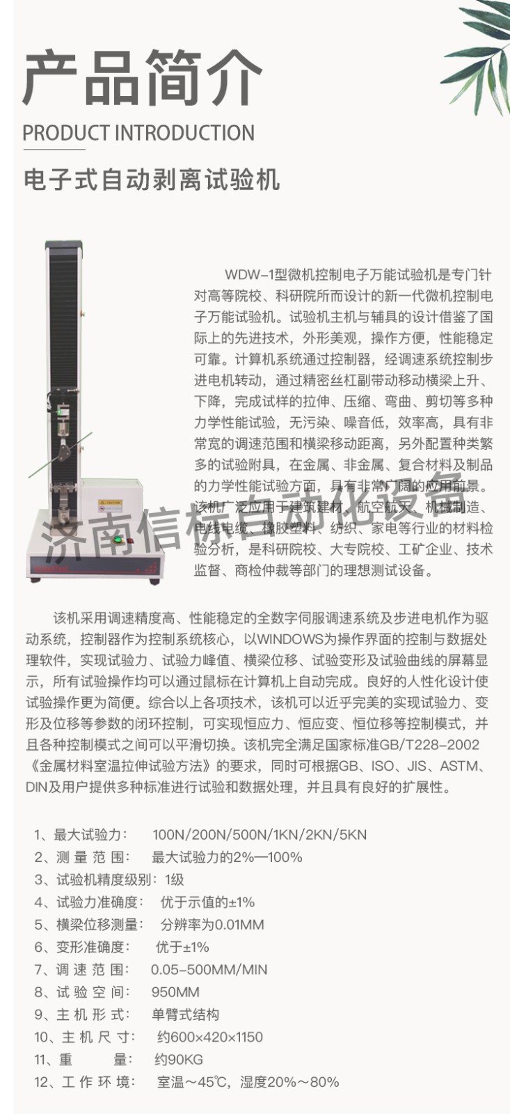 高強度膠黏劑膠帶浮棍法90度180度剝離強度試驗機主要功能及特點: 1、主機: 1.1調(diào)速系統(tǒng)采用伺服電機和自主研發(fā)減速系統(tǒng),性能穩(wěn)定可靠,具有過流、過壓、過載等保護(hù)裝置。調(diào)速范圍可達(dá)0.05~500mm/min。 1.2傳動部分采用圓弧同步齒形帶,精密絲杠副傳動,傳動平穩(wěn),噪音低,傳動效率高。 1.3萬向節(jié)采用十字插銷結(jié)構(gòu),而且具有擺角限制功能,一方面便于試樣夾持,保證試驗同心度,另一方面很好的消除了不規(guī)則試樣對傳感器的影響。 2、控制系統(tǒng)、操作軟件及數(shù)據(jù)處理系統(tǒng) 2.1計算機控制系統(tǒng),具有集成度高、性能穩(wěn)定、調(diào)整方便等優(yōu)點。可以對實驗數(shù)據(jù)進(jìn)行實時采集,對實驗特性曲線實現(xiàn)實時動態(tài)顯示,試驗數(shù)據(jù)文件能以Access常用數(shù)據(jù)庫或SQLserve大型數(shù)據(jù)庫的方式保存,方便實現(xiàn)客戶的資源共享及網(wǎng)絡(luò)管理,以及用戶的再分析。對于用戶自定義的各種word2000報表,該軟件可輕松實現(xiàn)訪問,解決了不同用戶或同一用戶在不同時期對試驗報表有不同需要的難題。該軟件可處理試驗力、位移、時間、變形的原始數(shù)據(jù)及由此派生的曲線。