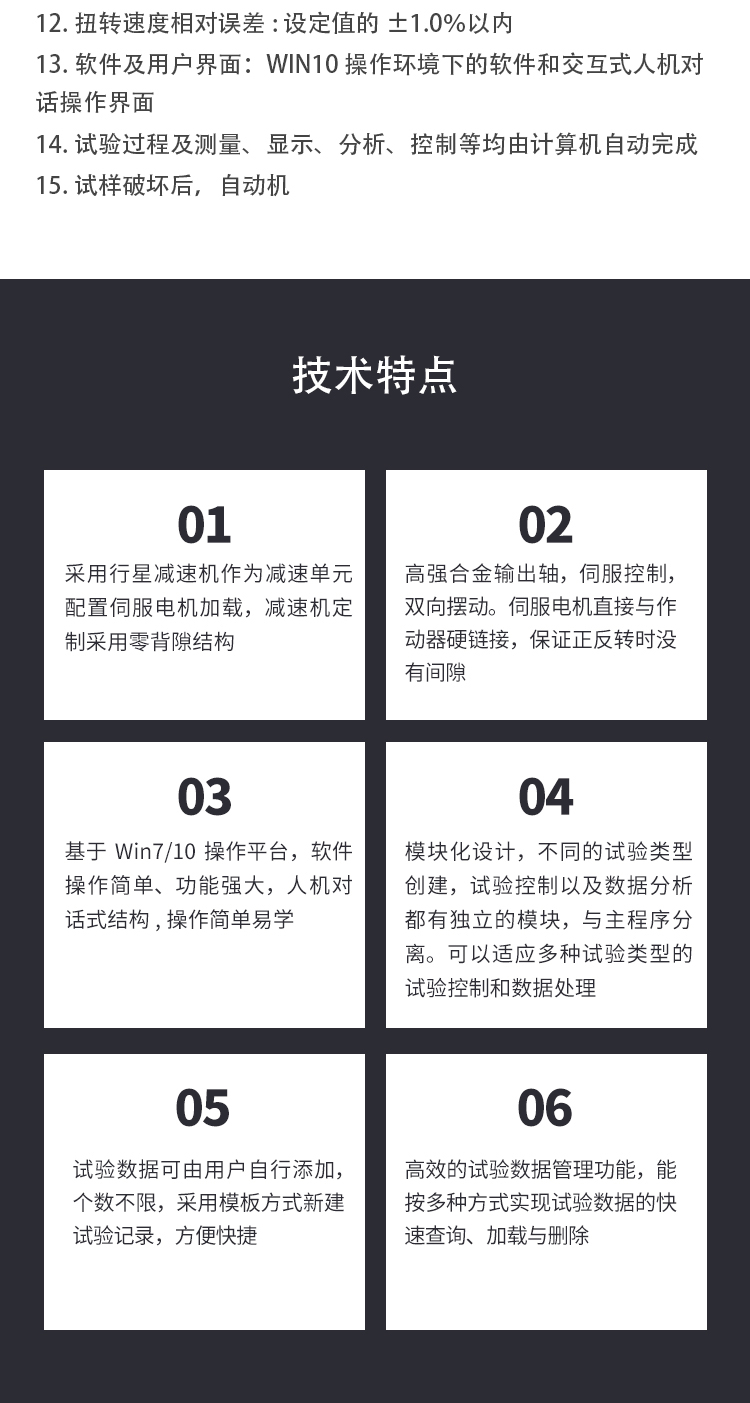 軟件部分: ?基于Win7/10操作平臺(tái),軟件操作簡(jiǎn)單、功能強(qiáng)大,人機(jī)對(duì)話式結(jié)構(gòu)。操作簡(jiǎn)單易學(xué) ?軟件采用模塊化設(shè)計(jì),不同的試驗(yàn)類型創(chuàng)建,試驗(yàn)控制以及數(shù)據(jù)分析都有獨(dú)立的模塊,與主程序分離??梢赃m應(yīng)多種試驗(yàn)類型的試驗(yàn)控制和數(shù)據(jù)處理 ?試驗(yàn)數(shù)據(jù)可由用戶自行添加,個(gè)數(shù)不限,采用模板方式新建試驗(yàn)記錄,方便快捷 ?自動(dòng)完成試驗(yàn)過(guò)程、判斷破型,自動(dòng)記錄保存試驗(yàn)數(shù)據(jù)。所有試驗(yàn)數(shù)據(jù)以國(guó)際通用的XML格式保存 ?高效的試驗(yàn)數(shù)據(jù)管理功能,能按多種方式實(shí)現(xiàn)試驗(yàn)數(shù)據(jù)的快速查詢、加載與刪除 ?試驗(yàn)結(jié)束系統(tǒng)自動(dòng)分析、統(tǒng)計(jì)試驗(yàn)結(jié)果,分析方式可由用戶自行設(shè)定 ?靈活的報(bào)表編輯功能,為用戶提供了面向圖形排版的專用報(bào)表編輯工具,簡(jiǎn)單易學(xué),能方便的打印試驗(yàn)曲線及相關(guān)圖片、文字 ?用戶可根據(jù)需要對(duì)試驗(yàn)數(shù)據(jù)進(jìn)行刪除 ?用戶可以根據(jù)需要改變分析方法,數(shù)據(jù)可以根據(jù)本身需要自行修改修約方式 ?專用的數(shù)據(jù)庫(kù)管理庫(kù)模塊 ?分四檔數(shù)碼顯示試驗(yàn)力值,精度為每檔量程20%開(kāi)始示值的±1% ?分四檔數(shù)碼顯示變形,精度為每檔量程20%開(kāi)始±0.5% ?同時(shí)記錄扭矩-時(shí)間,扭角-時(shí)間、扭矩-扭角、扭矩-轉(zhuǎn)角試驗(yàn)曲線,可隨時(shí)切換觀察,任意放大縮小,水平或垂直移動(dòng),實(shí)時(shí)高速采樣 ?采用人機(jī)交互方式分析計(jì)算測(cè)試材料的機(jī)械性能指標(biāo),試驗(yàn)結(jié)束時(shí)系統(tǒng)會(huì)自動(dòng)計(jì)算最大扭矩、抗扭強(qiáng)度、上下屈服扭矩、規(guī)定非比例扭矩、切變模量等,在自動(dòng)分析的基礎(chǔ)上,還可以人工干預(yù)修正分析結(jié)果,提高分析的準(zhǔn)確性