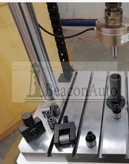 產(chǎn)品型號:PDS-5000L 橡膠襯套拉伸扭轉(zhuǎn)疲勞試驗(yàn)機(jī)是進(jìn)行橡膠襯套疲勞耐久性試驗(yàn)的專用設(shè)備;試驗(yàn)臺主要由擺動(dòng)加載系統(tǒng)、徑向伺服加載系統(tǒng)、扭矩測量控制系統(tǒng)、角度測量控制系統(tǒng)、負(fù)荷及位移測控系統(tǒng)等部分組成;計(jì)算機(jī)軟件采用C++編寫,具有靈活性和擴(kuò)展性。 產(chǎn)品用途: 本產(chǎn)品主要用于橡膠襯套,襯套起襯墊作用的環(huán)套 在閥門應(yīng)用領(lǐng)域,襯套在閥蓋之內(nèi),一般使用聚四氟乙烯或者石墨等耐腐材料,用于密封作用。裹住閥桿,磨損了,可以方便更換。具有靈活性和擴(kuò)展性,廣泛應(yīng)用于焊接點(diǎn)、彈簧鋼、管類、棒材、輪軸類等金屬和非金屬制品進(jìn)行扭轉(zhuǎn)測試,能獲得*扭矩、抗扭強(qiáng)度、上屈服強(qiáng)度和下屈服強(qiáng)度等性能參數(shù);并可以打印詳細(xì)的數(shù)據(jù)報(bào)告。 依據(jù)標(biāo)準(zhǔn): 1.GB/T 10128-1998 《金屬室溫扭轉(zhuǎn)試驗(yàn)方法》 2.GB/T 10128-2007 《金屬室溫扭轉(zhuǎn)試驗(yàn)方法》 技術(shù)指標(biāo): 1、徑向負(fù)荷加載力: 0--120Kn; 2、徑向力值測量精度: ±1% FS; 3、伺服油缸行程: 0-100mm; 4、徑向位移測量精度: ±1% FS; 5、靜態(tài)測量扭矩: ±2000Nm(靜態(tài)); 6、擺動(dòng)加載頻率: 0.1-10Hz; 7、擺動(dòng)角度: ±45°; 8、扭矩測量精度: ±1% FS (靜態(tài)); 9、擺動(dòng)工作頻率: 0.1-10Hz; 10、擺角分辨率: ±0.05° (靜態(tài)); 11、擺角精度: ±1%F.S (靜態(tài))。 12、加載波形: 正弦波、三角波等 13、擺動(dòng)控制方式: 扭矩、轉(zhuǎn)角 14、徑向加載控制方式: 負(fù)荷、位移 產(chǎn)品特點(diǎn): 1、適用于WINDOWS平臺的中文試驗(yàn)軟件,實(shí)現(xiàn)試驗(yàn)數(shù)據(jù)采集處理。 2、可實(shí)時(shí)采集試驗(yàn)數(shù)據(jù)、運(yùn)算處理、實(shí)時(shí)顯示并打印結(jié)果報(bào)告。 3、曲線遍歷:可用鼠標(biāo)對曲線數(shù)據(jù)逐點(diǎn)訪問,以便求取各種數(shù)據(jù)。扭矩與扭角關(guān)系曲線中能反映任意點(diǎn)扭矩—角度的關(guān)系,能方便地在曲線上找到所求數(shù)據(jù)點(diǎn);可方便地對曲線局部放大還原等。 4、根據(jù)需要可隨時(shí)對扭矩、角度測量通道進(jìn)行手動(dòng)或自動(dòng)清零。 5、自動(dòng)存盤:試驗(yàn)條件、試驗(yàn)數(shù)據(jù)自動(dòng)存盤,需要時(shí)可隨時(shí)調(diào)出。 6、批量試驗(yàn):試驗(yàn)條件設(shè)定后,可依次完成一批樣品的試驗(yàn),試驗(yàn)條件、試樣參數(shù)、測試數(shù)據(jù)、結(jié)果可存儲,隨時(shí)調(diào)用,再次試驗(yàn)無須設(shè)置。 7、打印試驗(yàn)報(bào)表。 工作原理: 主機(jī)徑向加載機(jī)構(gòu)采用雙立柱結(jié)構(gòu),臺面板和橫梁用厚鋼板制造,立柱采用鍍鉻圓柱,保證了整機(jī)加載時(shí)的剛度;位移傳感器同軸安裝在伺服油缸內(nèi)部,保證了測量的準(zhǔn)確性;采用伺服閥閉環(huán)控制油缸動(dòng)作,保證加載力和位移控制的準(zhǔn)確;伺服擺動(dòng)系統(tǒng)使用擺動(dòng)作動(dòng)器加載方式運(yùn)動(dòng),同軸安裝角度傳感器測量實(shí)時(shí)旋轉(zhuǎn)角度,并通過伺服控制器執(zhí)行控制;滑臺系統(tǒng)主要是為了安裝試樣方便,同時(shí)可滿足各種不同規(guī)格的試樣安裝位置要求;夾具系統(tǒng)采用同軸棒與試樣內(nèi)孔連接,并用螺母固定,試樣外圈與夾具體固定連接,徑向加載軸及旋轉(zhuǎn)軸均與同軸棒連接,通過同軸棒對內(nèi)圈加載及施加扭矩。 液壓源油泵機(jī)組采用三相異步電機(jī)加齒輪泵構(gòu)成,系統(tǒng)壓力通過溢流閥設(shè)定,輸出到系統(tǒng)的壓力油經(jīng)過了小于6μm過濾精度的過濾器的過濾,保證伺服閥安全可靠的進(jìn)行工作?;赜瓦^濾器對回到油箱的液壓油進(jìn)行過濾,保證油箱中液壓油的清潔。 產(chǎn)品構(gòu)成: 試驗(yàn)臺分為徑向加載和伺服擺動(dòng)加載兩個(gè)通道,其中徑向加載通道由固定橫梁和立柱組成,位于工作臺面之上,液壓缸和伺服閥裝于橫梁之上。負(fù)荷傳感器與油缸活塞桿相對固定,位移傳感器為磁滯伸縮式,傳感器主體固定在液壓缸底部,磁環(huán)固定在液壓活塞上,隨液壓缸運(yùn)動(dòng)產(chǎn)生磁信號變化從而測量位移信號。 伺服擺動(dòng)通道是由一套旋轉(zhuǎn)擺動(dòng)缸和角度傳感器組成位于工作臺左側(cè),擺動(dòng)作動(dòng)器是試驗(yàn)臺的關(guān)鍵器件,主要由擺動(dòng)缸、角傳感器、伺服閥、蓄能器等組成。擺動(dòng)液壓缸采用我公司自主研發(fā)生產(chǎn)產(chǎn)品,該作動(dòng)器采用雙葉片,前法蘭安裝方式;該產(chǎn)品具有低摩擦、低阻尼、高頻響及良好的抗側(cè)向力能力;使用溫度范圍廣、承載能力高、在低速下無爬行現(xiàn)象。角度傳感器和擺動(dòng)缸活塞桿同軸安裝,選用長春一光產(chǎn)品,角度測量是絕對式測量,測量精度高,環(huán)境適應(yīng)性好。 扭矩傳感器測量系統(tǒng)位于臺面右側(cè),襯套工裝位于臺面之上連接傳感器擺動(dòng)缸之間,襯套通過支架與扭矩傳感器法蘭連接,從而測量試件扭轉(zhuǎn)時(shí)內(nèi)套和外套的相對角度。扭矩加載由擺動(dòng)缸通過計(jì)算機(jī)程序控制來實(shí)現(xiàn),扭矩加載通道安裝在移動(dòng)