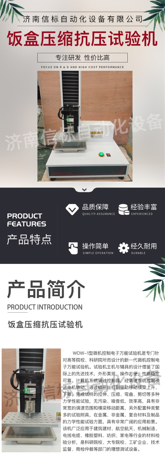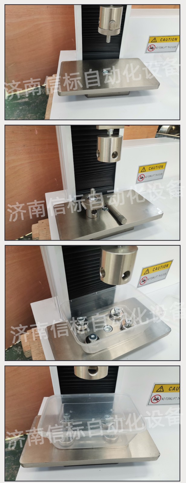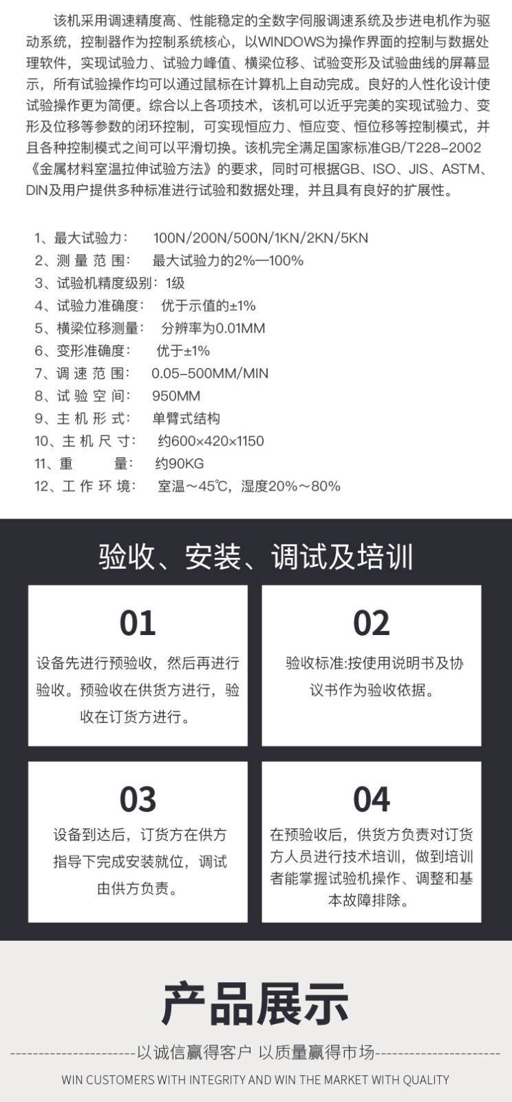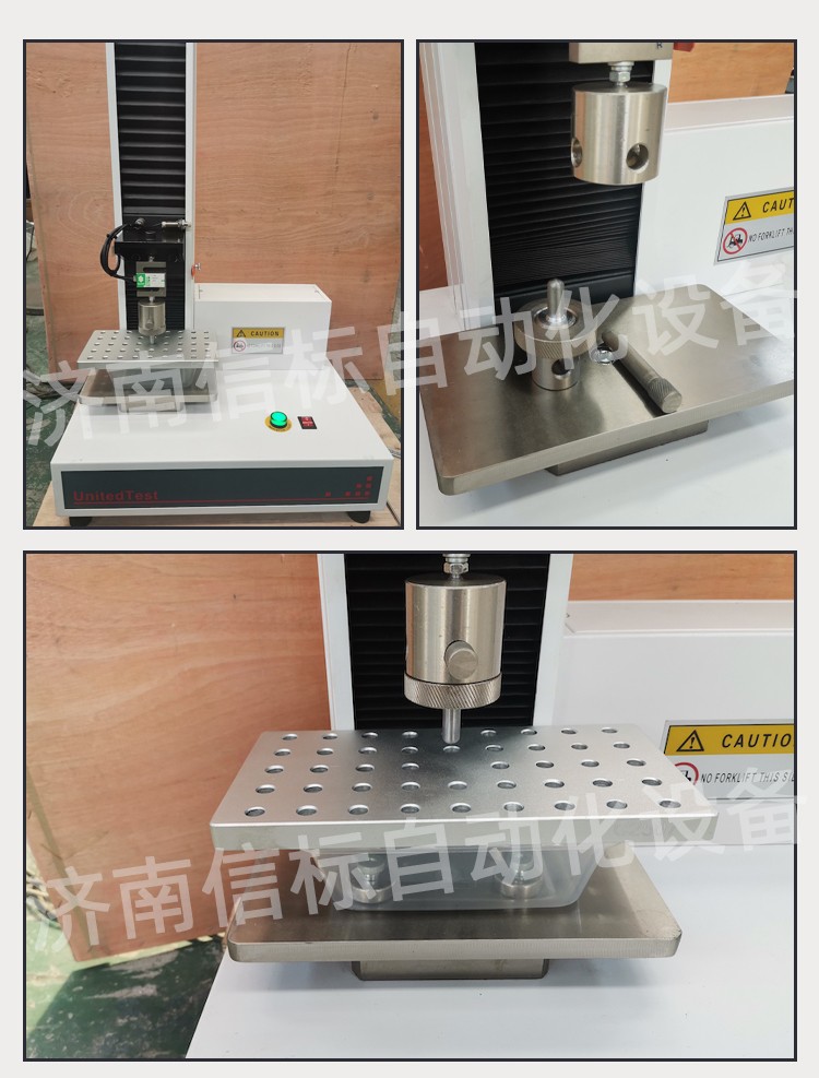 飯盒壓縮抗壓試驗(yàn)機(jī) 單臂壓力萬能試驗(yàn)機(jī)主要技術(shù)指標(biāo): 1、 最大試驗(yàn)力: 100N/200N/500N/1KN/2KN/5KN 2、 測(cè) 量 范 圍: 最大試驗(yàn)力的2%—100% 3、 試驗(yàn)機(jī)精度級(jí)別:1級(jí) 4、 試驗(yàn)力準(zhǔn)確度: 優(yōu)于示值的±1% 5、 橫梁位移測(cè)量: 分辨率為0.01mm 6、 變形準(zhǔn)確度: 優(yōu)于±1% 7、 調(diào) 速 范 圍: 0.05-500mm/min 8、 試 驗(yàn) 空 間: 950mm 9、 主 機(jī) 形 式: 單臂式結(jié)構(gòu) 10、 主 機(jī) 尺 寸: 約600×420×1150 11、 重 量: 約90Kg 12、 工 作 環(huán) 境: 室溫~45℃,濕度20%~80% 飯盒壓縮抗壓試驗(yàn)機(jī) 單臂壓力萬能試驗(yàn)機(jī)主要功能及特點(diǎn): 主機(jī): 1.1調(diào)速系統(tǒng)采用伺服電機(jī)和自主研發(fā)減速系統(tǒng),性能穩(wěn)定可靠,具有過流、過壓、過載等保護(hù)裝置。調(diào)速范圍可達(dá)0.05~500mm/min。 1.2傳動(dòng)部分采用圓弧同步齒形帶,精密絲杠副傳動(dòng),傳動(dòng)平穩(wěn),噪音低,傳動(dòng)效率高。 1.3萬向節(jié)采用十字插銷結(jié)構(gòu),而且具有擺角限制功能,一方面便于試樣夾持,保證試驗(yàn)同心度,另一方面很好的消除了不規(guī)則試樣對(duì)傳感器的影響。 2、控制系統(tǒng)、操作軟件及數(shù)據(jù)處理系統(tǒng) 2.1計(jì)算機(jī)控制系統(tǒng),具有集成度高、性能穩(wěn)定、調(diào)整方便等優(yōu)點(diǎn)??梢詫?duì)實(shí)驗(yàn)數(shù)據(jù)進(jìn)行實(shí)時(shí)采集,對(duì)實(shí)驗(yàn)特性曲線實(shí)現(xiàn)實(shí)時(shí)動(dòng)態(tài)顯示,試驗(yàn)數(shù)據(jù)文件能以Access常用數(shù)據(jù)庫或SQLserve大型數(shù)據(jù)庫的方式保存,方便實(shí)現(xiàn)客戶的資源共享及網(wǎng)絡(luò)管理,以及用戶的再分析。對(duì)于用戶自定義的各種word2000報(bào)表,該軟件可輕松實(shí)現(xiàn)訪問,解決了不同用戶或同一用戶在不同時(shí)期對(duì)試驗(yàn)報(bào)表有不同需要的難題。該軟件可處理試驗(yàn)力、位移、 時(shí)間、變形的原始數(shù)據(jù)及由此派生的曲線。