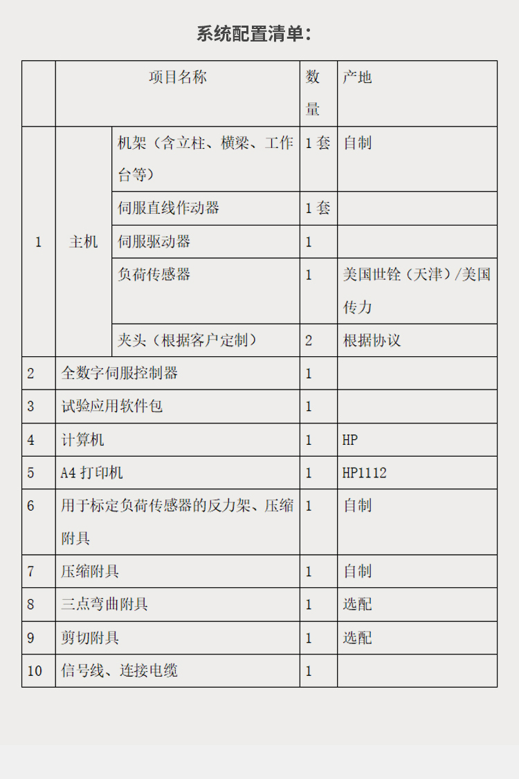 技術(shù)指標(biāo): 3.1 Z大靜態(tài)試驗(yàn)力:±20kN,全程不分檔,在1-100.%范圍內(nèi),示值精度20%起±1%。 3.2 Z大動(dòng)態(tài)試驗(yàn)力:±20kN,幅值波動(dòng)度不大于±2%FS,(滿足《JB/T9397-2002 拉壓疲勞試驗(yàn)機(jī) 技術(shù)條件》)。 3.3 作動(dòng)器振幅:±50mm,示值精度20%起±0.5%FS。 3.4 頻率范圍:0.01—15Hz。 3.5幅頻特性:(取決于系統(tǒng)流量) 3.6 Z大速度:250mm/s。 3.7 控制器類型:?jiǎn)瓮ǖ溃灰坪土陕烽]環(huán)通道。 3.8 主要試驗(yàn)波形:正弦波、三角波、矩形波、斜波等。 3.9 試驗(yàn)空間:高度750mm,試驗(yàn)寬度420mm。 3.10 主機(jī)剛度:2.5×108 N/m。 3.11圓試樣夾持范圍:φ5—φ15mm。 3.12 主機(jī)重量:650kg 3.13整機(jī)功率:5kw 系統(tǒng)配置清單: 項(xiàng)目名稱 數(shù)量 產(chǎn)地 1 主機(jī) 機(jī)架(含立柱、橫梁、工作臺(tái)等) 1套 自制 伺服直線作動(dòng)器 1套 伺服驅(qū)動(dòng)器 1 負(fù)荷傳感器 1 美國(guó)世銓(天津)/美國(guó)傳力 夾頭(根據(jù)客戶定制) 2 根據(jù)協(xié)議 2 全數(shù)字伺服控制器 1 3 試驗(yàn)應(yīng)用軟件包 1 4 計(jì)算機(jī) 1 HP 5 A4打印機(jī) 1 HP1112 6 用于標(biāo)定負(fù)荷傳感器的反力架、壓縮附具 1 自制 7 壓縮附具 1 自制 8 三點(diǎn)彎曲附具 1 選配 9 剪切附具 1 選配 10 信號(hào)線、連接電纜 1
