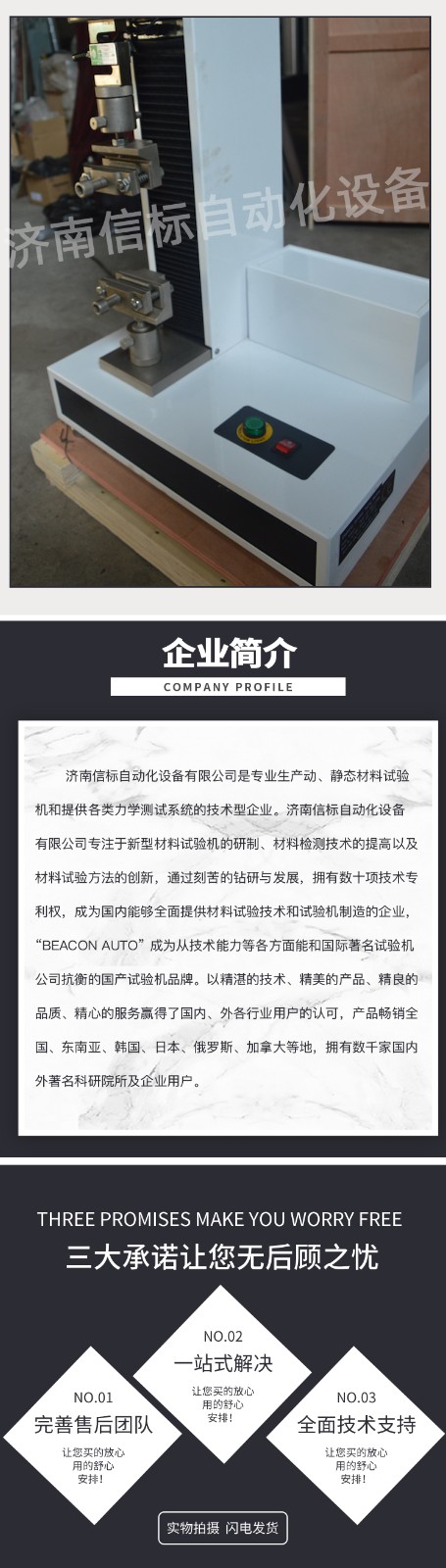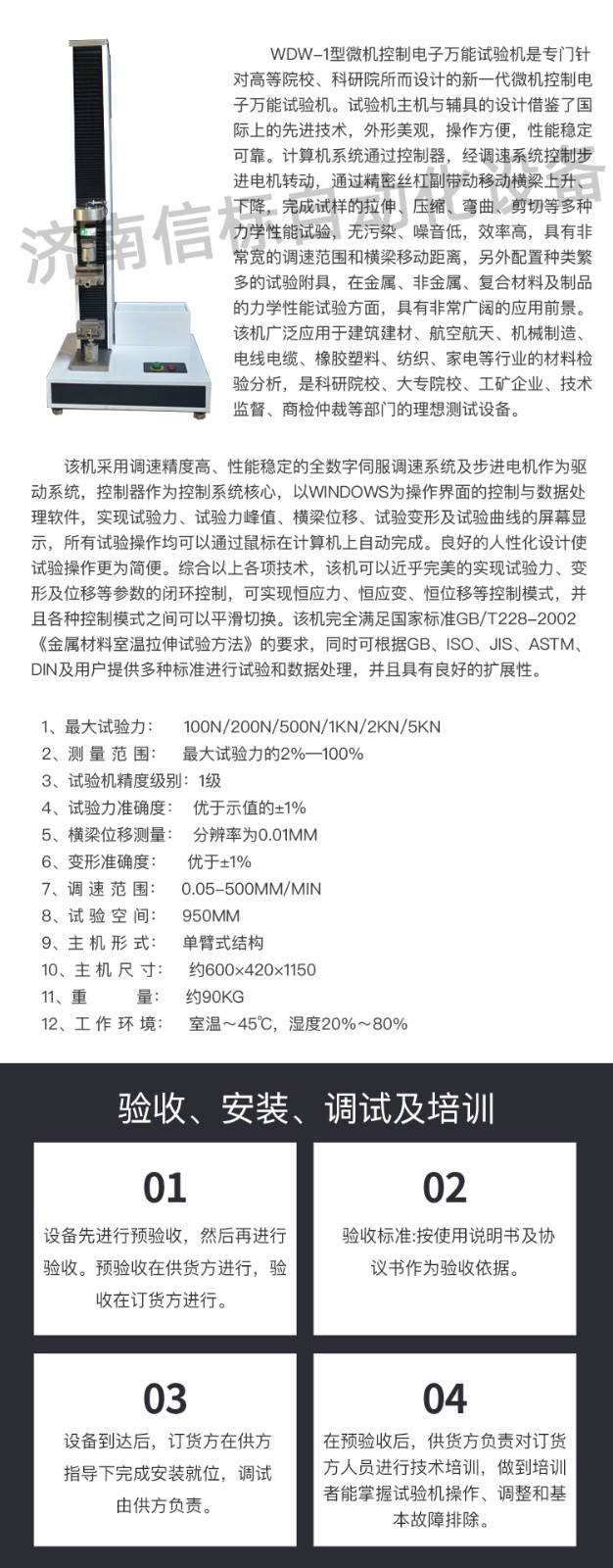 飯盒壓縮抗壓試驗(yàn)機(jī) 單臂壓力萬能試驗(yàn)機(jī)主要技術(shù)指標(biāo): 1、 最大試驗(yàn)力: 100N/200N/500N/1KN/2KN/5KN 2、 測 量 范 圍: 最大試驗(yàn)力的2%—100% 3、 試驗(yàn)機(jī)精度級(jí)別:1級(jí) 4、 試驗(yàn)力準(zhǔn)確度: 優(yōu)于示值的±1% 5、 橫梁位移測量: 分辨率為0.01mm 6、 變形準(zhǔn)確度: 優(yōu)于±1% 7、 調(diào) 速 范 圍: 0.05-500mm/min 8、 試 驗(yàn) 空 間: 950mm 9、 主 機(jī) 形 式: 單臂式結(jié)構(gòu) 10、 主 機(jī) 尺 寸: 約600×420×1150 11、 重 量: 約90Kg 12、 工 作 環(huán) 境: 室溫~45℃,濕度20%~80% 飯盒壓縮抗壓試驗(yàn)機(jī) 單臂壓力萬能試驗(yàn)機(jī)主要功能及特點(diǎn): 主機(jī): 1.1調(diào)速系統(tǒng)采用伺服電機(jī)和自主研發(fā)減速系統(tǒng),性能穩(wěn)定可靠,具有過流、過壓、過載等保護(hù)裝置。調(diào)速范圍可達(dá)0.05~500mm/min。 1.2傳動(dòng)部分采用圓弧同步齒形帶,精密絲杠副傳動(dòng),傳動(dòng)平穩(wěn),噪音低,傳動(dòng)效率高。 1.3萬向節(jié)采用十字插銷結(jié)構(gòu),而且具有擺角限制功能,一方面便于試樣夾持,保證試驗(yàn)同心度,另一方面很好的消除了不規(guī)則試樣對(duì)傳感器的影響。 2、控制系統(tǒng)、操作軟件及數(shù)據(jù)處理系統(tǒng) 2.1計(jì)算機(jī)控制系統(tǒng),具有集成度高、性能穩(wěn)定、調(diào)整方便等優(yōu)點(diǎn)??梢詫?duì)實(shí)驗(yàn)數(shù)據(jù)進(jìn)行實(shí)時(shí)采集,對(duì)實(shí)驗(yàn)特性曲線實(shí)現(xiàn)實(shí)時(shí)動(dòng)態(tài)顯示,試驗(yàn)數(shù)據(jù)文件能以Access常用數(shù)據(jù)庫或SQLserve大型數(shù)據(jù)庫的方式保存,方便實(shí)現(xiàn)客戶的資源共享及網(wǎng)絡(luò)管理,以及用戶的再分析。對(duì)于用戶自定義的各種word2000報(bào)表,該軟件可輕松實(shí)現(xiàn)訪問,解決了不同用戶或同一用戶在不同時(shí)期對(duì)試驗(yàn)報(bào)表有不同需要的難題。該軟件可處理試驗(yàn)力、位移、 時(shí)間、變形的原始數(shù)據(jù)及由此派生的曲線。