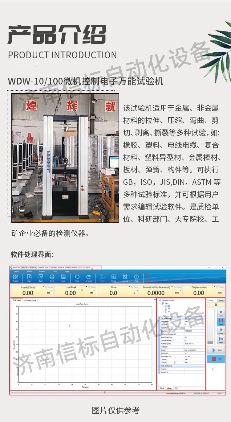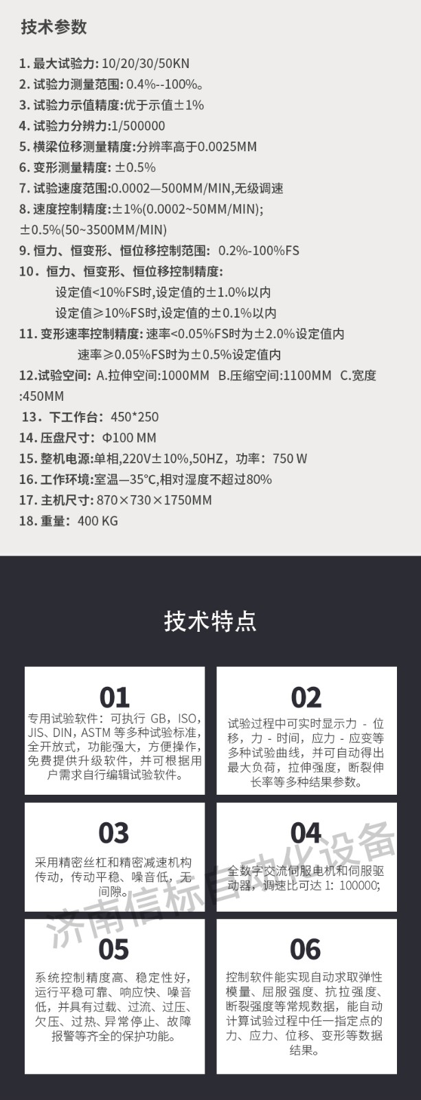 該試驗(yàn)機(jī)適用于金屬、非金屬材料的拉伸、壓縮、彎曲、剪切、剝離、撕裂等多種試驗(yàn),如:橡膠、塑料、電線電纜、復(fù)合材料、塑料異型材、金屬棒材、板材、彈簧、構(gòu)件等??蓤?zhí)行GB,ISO,JIS,DIN,ASTM等多種試驗(yàn)標(biāo)準(zhǔn),并可根據(jù)用戶(hù)需求編輯試驗(yàn)軟件。是質(zhì)檢單位、科研部門(mén)、大專(zhuān)院校、工礦企業(yè)必備的檢測(cè)儀器。 二、測(cè)量參數(shù): 1. 最大試驗(yàn)力: 10/20/30/50kN 2. 試驗(yàn)力測(cè)量范圍: 0.4%--100%。 3. 試驗(yàn)力示值精度:優(yōu)于示值±1% 4. 試驗(yàn)力分辨力:1/500000 5. 橫梁位移測(cè)量精度:分辨率高于0.0025mm 6. 變形測(cè)量精度: ±0.5% 7. 試驗(yàn)速度范圍:0.0002—500mm/min,無(wú)級(jí)調(diào)速 8. 速度控制精度:±1%(0.0002~50mm/min); ±0.5%(50~3500mm/min) 9. 恒力、恒變形、恒位移控制范圍: 0.2%-100%FS 10.恒力、恒變形、恒位移控制精度: 設(shè)定值<10%FS時(shí),設(shè)定值的±1.0%以?xún)?nèi) 設(shè)定值≥10%FS時(shí),設(shè)定值的±0.1%以?xún)?nèi) 11. 變形速率控制精度: 速率<0.05%FS時(shí)為±2.0%設(shè)定值內(nèi) 速率≥0.05%FS時(shí)為±0.5%設(shè)定值內(nèi) 12.試驗(yàn)空間: A.拉伸空間:1000mm B.壓縮空間:1100mm C.寬度:450mm 13.下工作臺(tái):450*250 14. 壓盤(pán)尺寸:φ100 mm 15. 整機(jī)電源:單相,220V±10%,50Hz,功率:750 W 16. 工作環(huán)境:室溫—35℃,相對(duì)濕度不超過(guò)80% 17. 主機(jī)尺寸: 870×730×1750mm 18. 重量:400 kg 三、產(chǎn)品配置: 1、主機(jī) 一套 2、松下A7全數(shù)字伺服電機(jī)及伺服驅(qū)動(dòng)器; 一套 3、高精度負(fù)荷傳感器; 5kn/1kn/500N/200/ 各一支 4、Hiwin精密滾珠絲杠; 2支 5、光電編碼器(2500線,內(nèi)置); 1支 6、夾具:滿(mǎn)足海綿/汽車(chē)座椅所需工裝 1套(有多種)