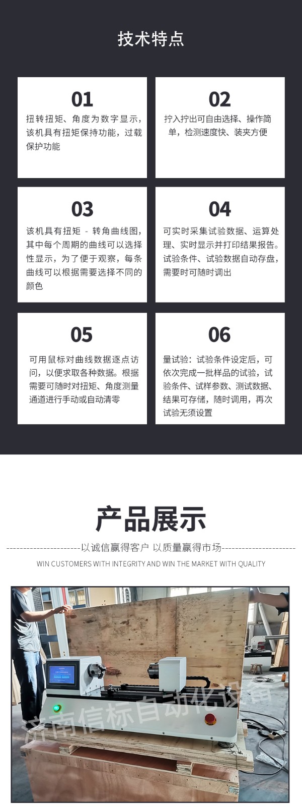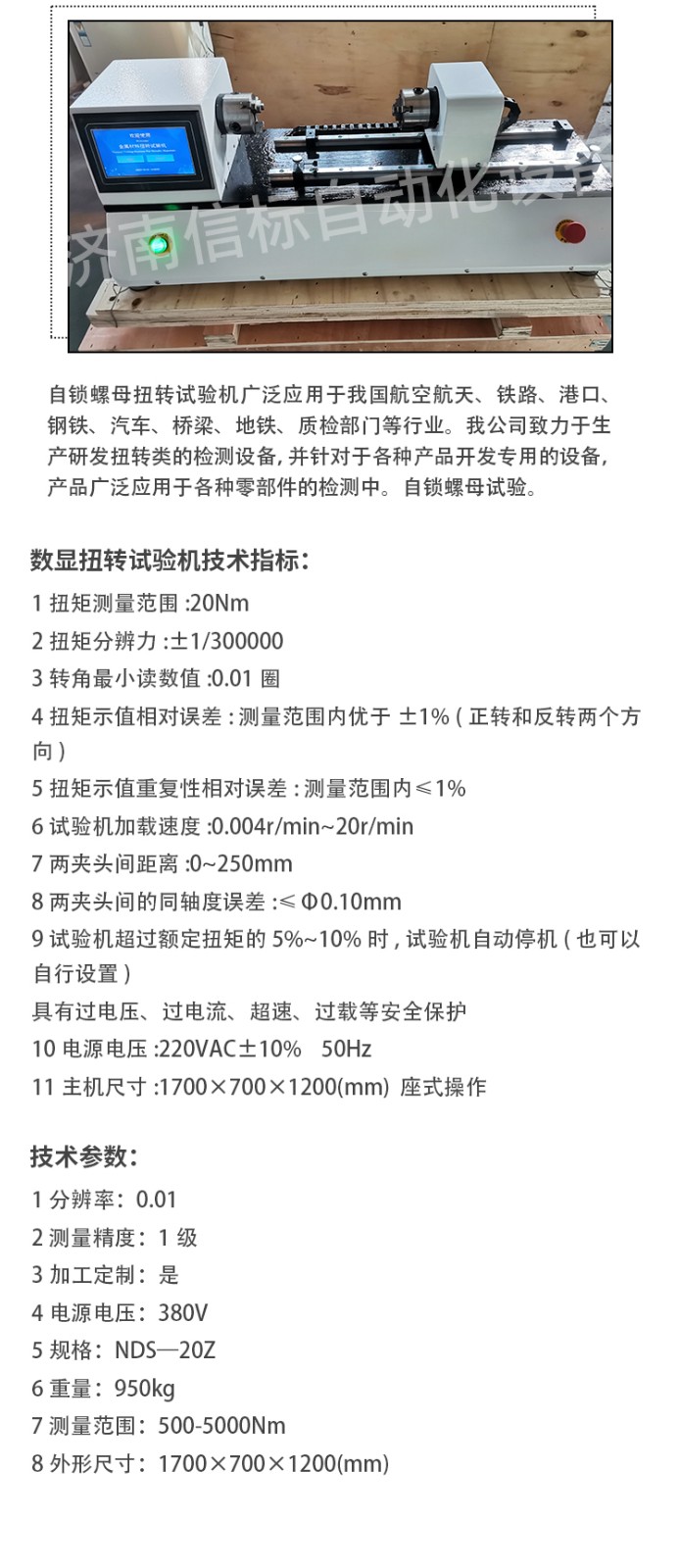 數(shù)顯扭轉(zhuǎn)試驗機技術(shù)指標(biāo): 1 扭矩測量范圍:20Nm 2 扭矩分辨力:±1/300000 3 轉(zhuǎn)角最小讀數(shù)值:0.01圈 4 扭矩示值相對誤差:測量范圍內(nèi)優(yōu)于±1% (正轉(zhuǎn)和反轉(zhuǎn)兩個方向) 5 扭矩示值重復(fù)性相對誤差:測量范圍內(nèi)≤1% 6 試驗機加載速度:0.004r/min~20r/min 7 兩夾頭間距離:0~250mm 8 兩夾頭間的同軸度誤差:≤Φ0.10mm 9 試驗機超過額定扭矩的5%~10%時,試驗機自動停機(也可以自行設(shè)置) 具有過電壓、過電流、超速、過載等安全保護 10 電源電壓:220VAC±10% 50Hz 11 主機尺寸:1700×700×1200(mm) 座式操作 功能特點: 1、適用于WINDOWS平臺的中文試驗軟件,實現(xiàn)試驗數(shù)據(jù)采集處理。 2、可實時采集試驗數(shù)據(jù)、運算處理、實時顯示并打印結(jié)果報告。 3、曲線遍歷:可用鼠標(biāo)對曲線數(shù)據(jù)逐點訪問,以便求取各種數(shù)據(jù)。扭矩與扭角關(guān)系曲線中能反映任意點扭矩—角度的關(guān)系,能方便地在曲線上找到所求數(shù)據(jù)點;可方便地對曲線局部放大還原等。 4、根據(jù)需要可隨時對扭矩、角度測量通道進行手動或自動清零。 5、自動存盤:試驗條件、試驗數(shù)據(jù)自動存盤,需要時可隨時調(diào)出。 6、批量試驗:試驗條件設(shè)定后,可依次完成一批樣品的試驗,試驗條件、試樣參數(shù)、測試數(shù)據(jù)、結(jié)果可存儲,隨時調(diào)用,再次試驗無須設(shè)置。 7、打印試驗報表。